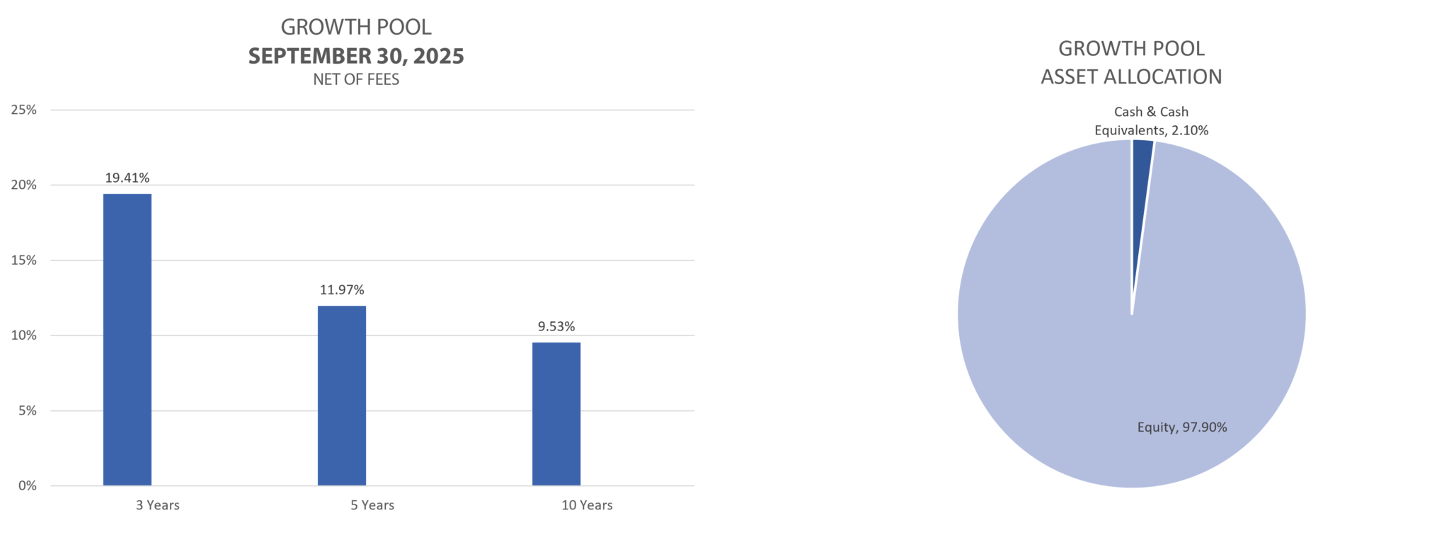 The growth pool is designed to mirror the market performance and experiences growth and fluctuations while adhering to an acceptable level of risk through equity level diversification. This portfolio has the highest risk, yet generally offers the highest return.