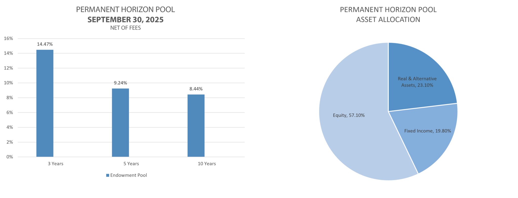 The Permanent Horizon pool is designed to remain steady and provide fund holders with a consistent stream of income and purchasing power over time. Assets are held in a conservative and prudently-managed portfolio that includes a mix of both active and passive investments.